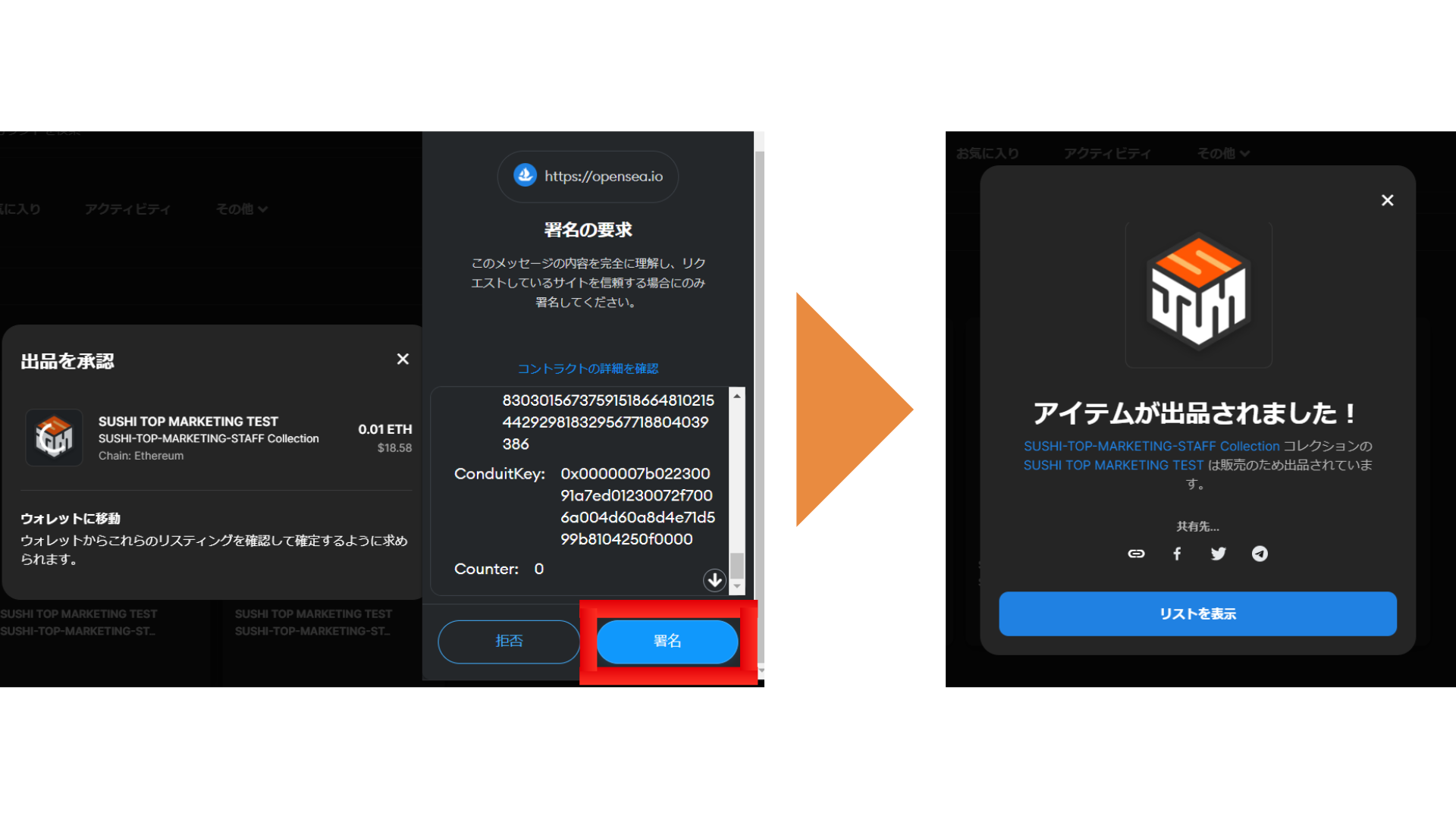 MetaMaskの場合は、ポップアップの「署名」をクリックすることで、出品手続きが完了します。