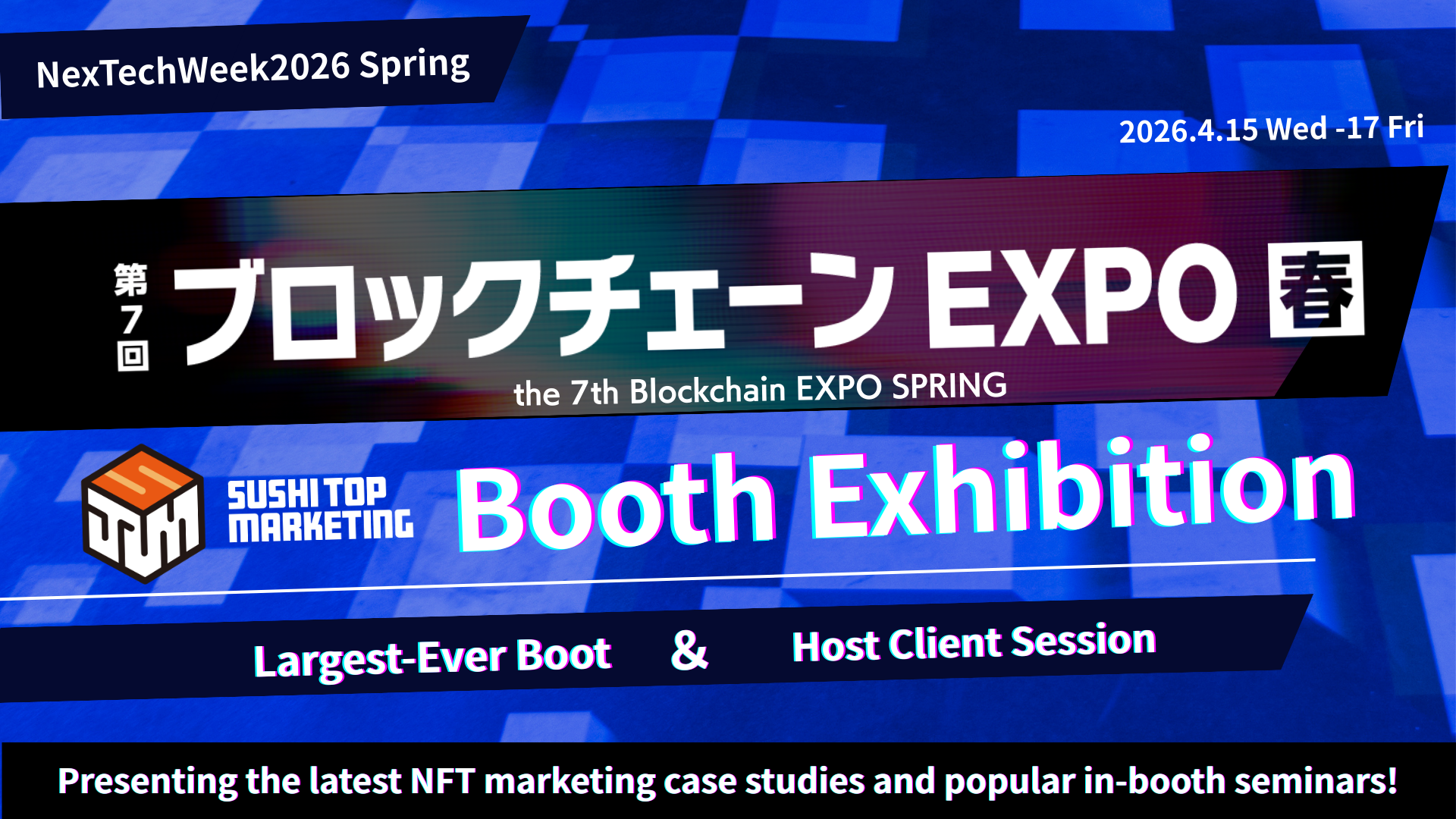 SUSHI TOP MARKETING INC. (Headquarters: Chiyoda-ku, Tokyo; CEO: Daisuke Tokunaga; hereinafter "the Company") is pleased to announce its participation in the 7th Blockchain EXPO SPRING at Tokyo Big Sight. This year, the Company will feature its largest-ever exhibition booth and host a featured "Blockchain Case Studies" client session.