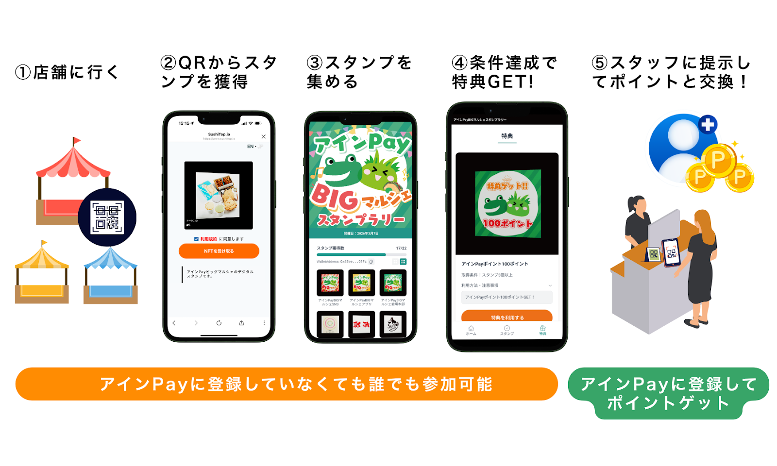 SUSHI TOP MARKETING株式会社(本社:東京都千代田区、代表取締役CEO:徳永 大輔、以下「当社」)は、一般社団法人 東村山地域振興機構(所在地:東京都東村山市、代表理事:當麻 武勇、以下「東村山地域振興機構」)が運営するデジタル地域通貨「東村山アインPay」と連携し、2026年3月7日(土)に東村山市内で開催された「アインPay BIGマルシェ」にて、NFTデジタルスタンプラリーの実証実験を実施しました。