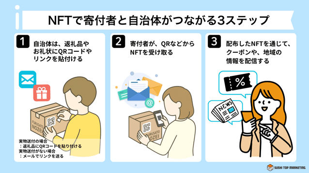 自治体は発行したNFTを寄付者の方に配布するだけで、寄付者とNFTを介してつながれるようになります。