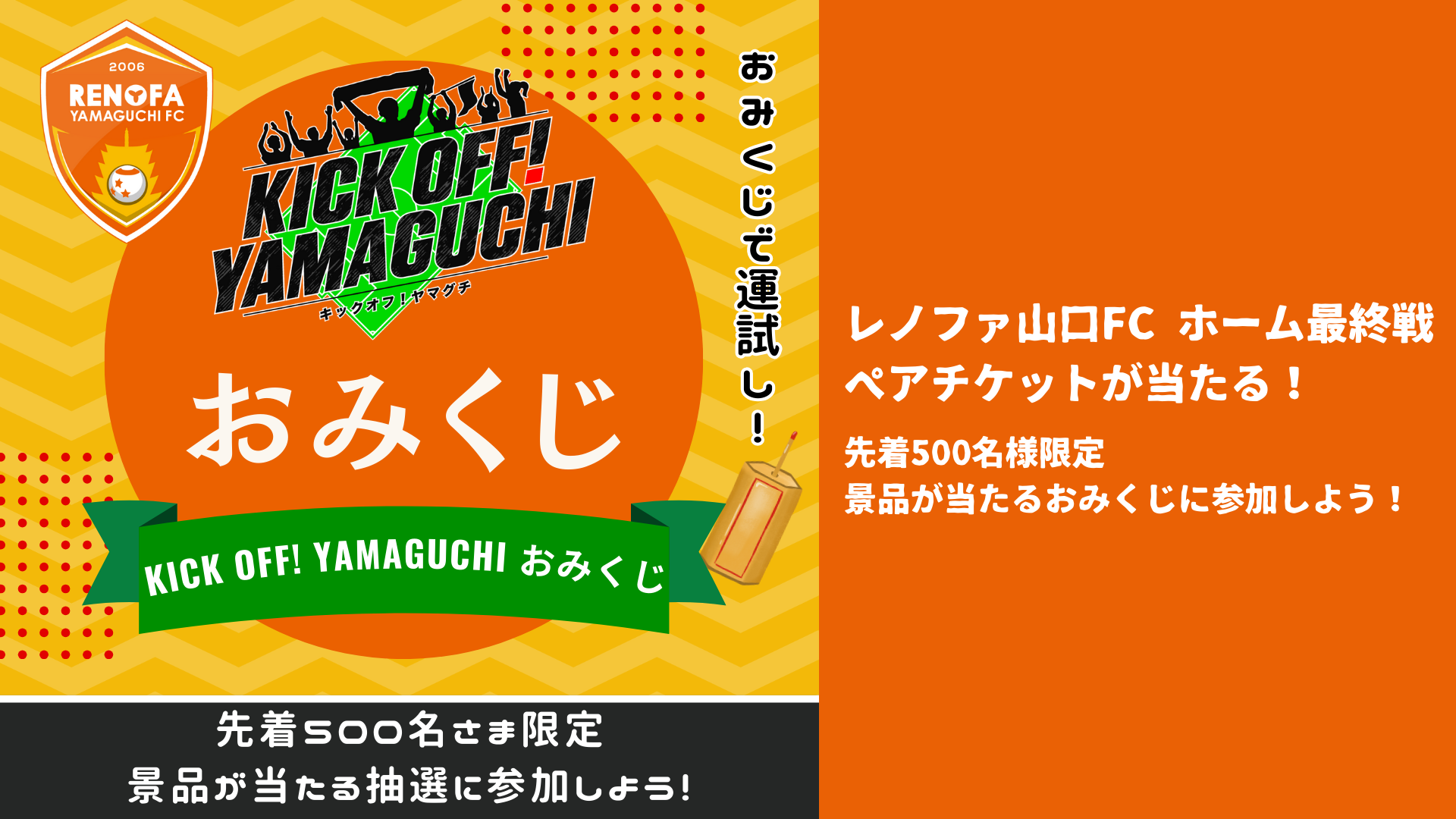 『KICK OFF! YAMAGUCHI おみくじ』とは、番組内(およびSNS等)でデジタルおみくじをご提供し、そのおみくじ結果に応じて、視聴者の皆様に特典をプレゼントする企画です。 先着500名の方がご参加いただけ、大吉などが出た場合には、ホーム最終戦のペアチケットなどがもらえました。