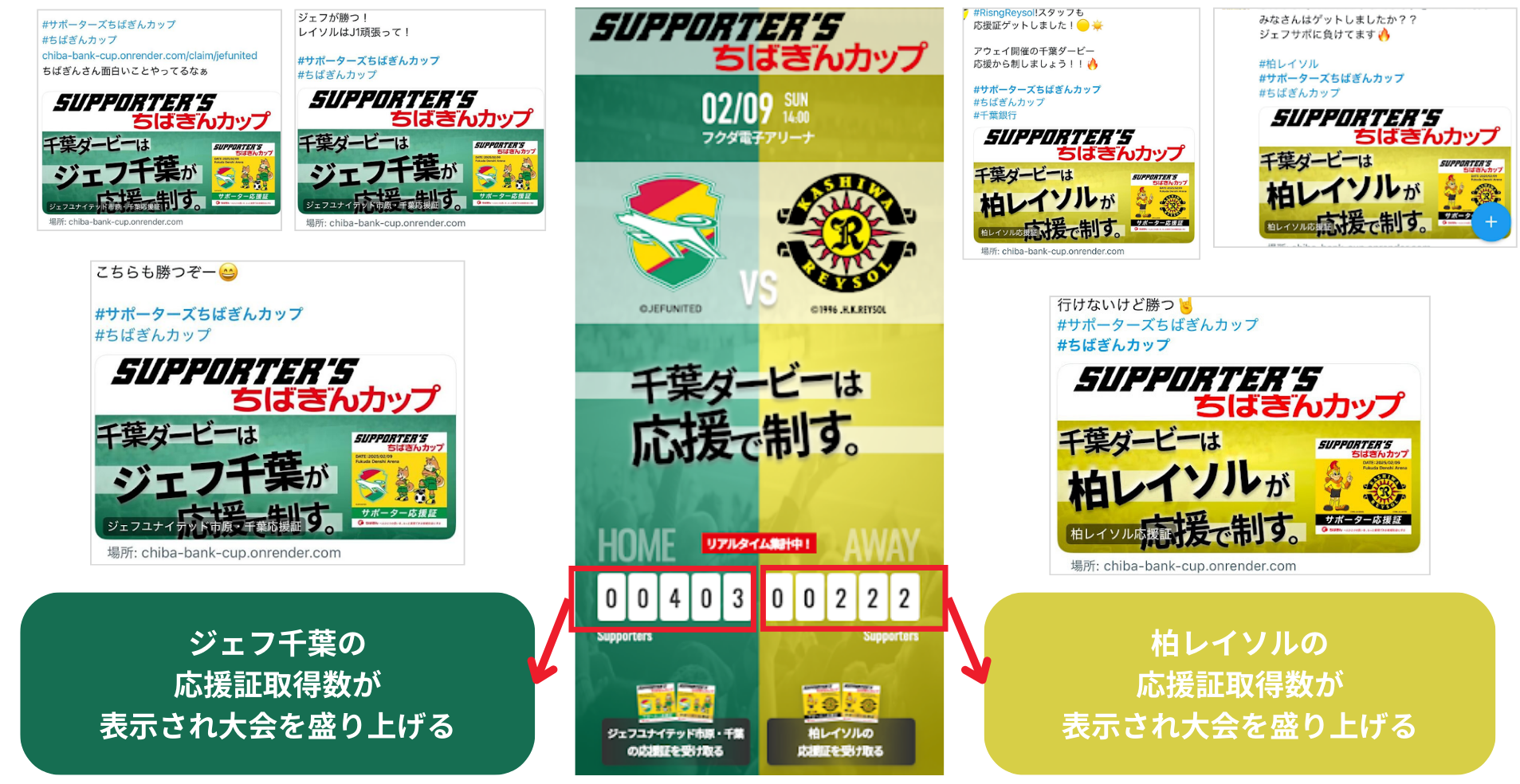 各チームの応援証明取得数がLPに表示され、かつX連携があり、拡散力の大きい企画に